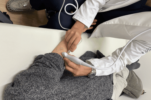 治療中に患部が熱く感じたり、施術後に内出血がみられることがありますが、多くは一時的なもので、自然に改善します。神経の近くの血管もエコーで確認しながら安全に処置しますのでご安心ください。