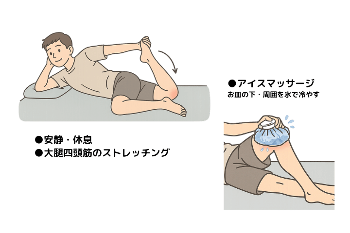 成長期の一過性の病気であり、ますはスポーツを控えましょう。症状を強くさせないためには、大腿四頭筋を伸ばすストレッチや痛いところのアイスマッサージ等を行い、痛みが強い時のみ内服や湿布薬を使います。