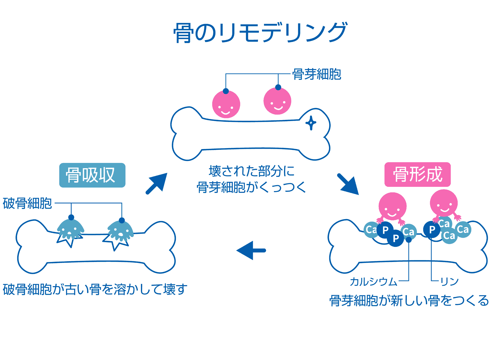 まず「破骨細胞(はこつさいぼう)」という細胞が、古くなった骨を削り取ります(これを「骨吸収」といいます)。その後、「骨芽細胞(こつがさいぼう)」という細胞がそこに集まって、新しい骨を作ります(これを「骨形成」といいます)。