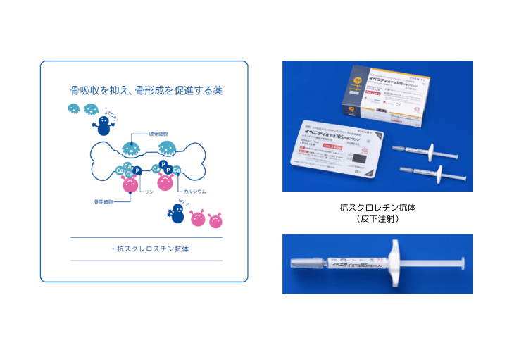 抗スクレロスチン抗体はこの働きを抑えることで骨形成を促し、同時に骨吸収も抑えて骨量(骨密度)を増やします。皮下注射薬で、医療機関にて月1回、12カ月間投与します。