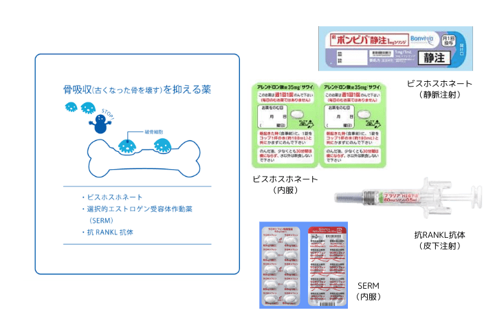 骨吸収抑制薬とは、「骨が壊れるのをゆるやかにする薬」です。
