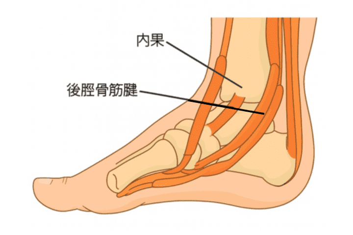 初めは運動後に足首の内側や後ろに痛みが出る程度ですが、次第に痛みが強くなり腫れが生じます。進行すると立ったり歩いたりするのが難しくなり、つま先立ちでも強い痛みを感じます。腱が完全に切れるとつま先立ちができず、土踏まずが突然崩れて偏平足のように見えることもあります。腱鞘炎では内くるぶし周囲に急な痛みと腫れが起こり、腱が太くなったように感じる場合があります。