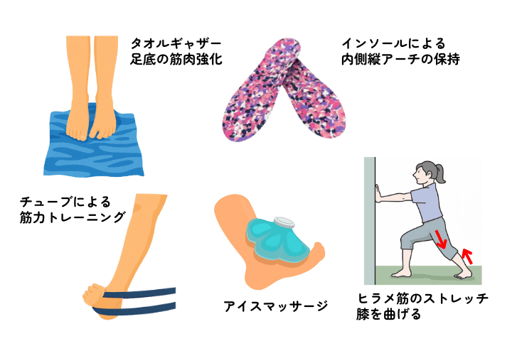 痛みが強い場合は慢性化を避けるために運動量を減らす必要があり、アイスマッサージや外用薬の使用、足底や足関節周囲の筋肉の強化やストレッチングを行います。足底板(インソール)も効果的で、クッション性が良くかかとの安定したシューズを選ぶことも重要です。