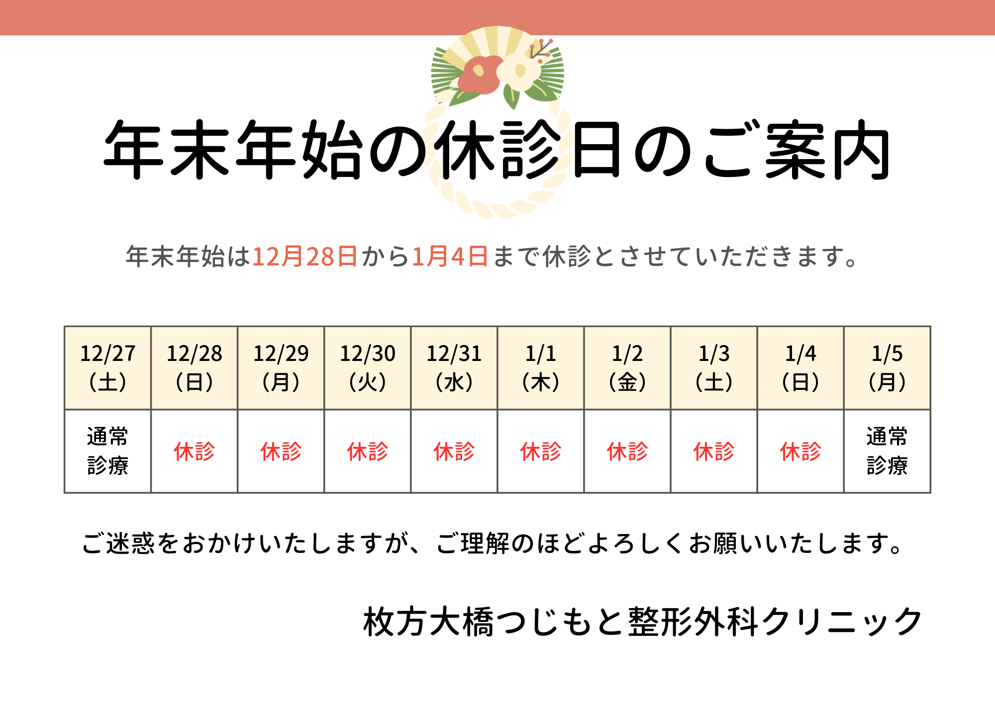 年末年始休診日のお知らせ 2025 11/23 お知らせ 記事一覧 2025年11月23日 当院は、年末年始のため12月28日(日)~1月4日(日)まで休診 とさせていただきます。 新年は 1月5日(月)より通常通り診療 を開始いたします。 期間中はご不便をおかけいたしますが、何卒ご理解のほどよろしくお願い申し上げます。 お知らせ 記事一覧 シェアしていただけると嬉しいです! URLをコピーしました! URLをコピーしました!